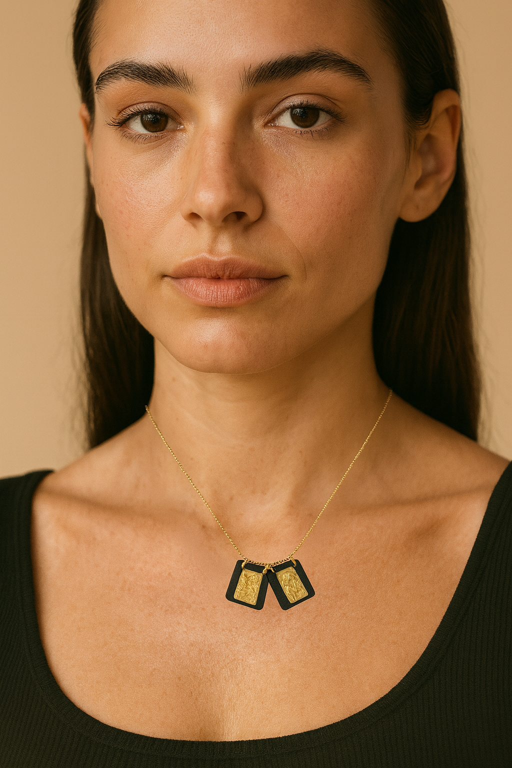 Celebrate faith with elegance in our Black Enamel Scapular Duo Necklace. Featuring Our Lady of Mount Carmel and Sacred Heart on delicately enameled white square bases, each charm is 18K gold-plated and suspended from a polished bead chain—perfect worn solo or layered for a modern devotional look.