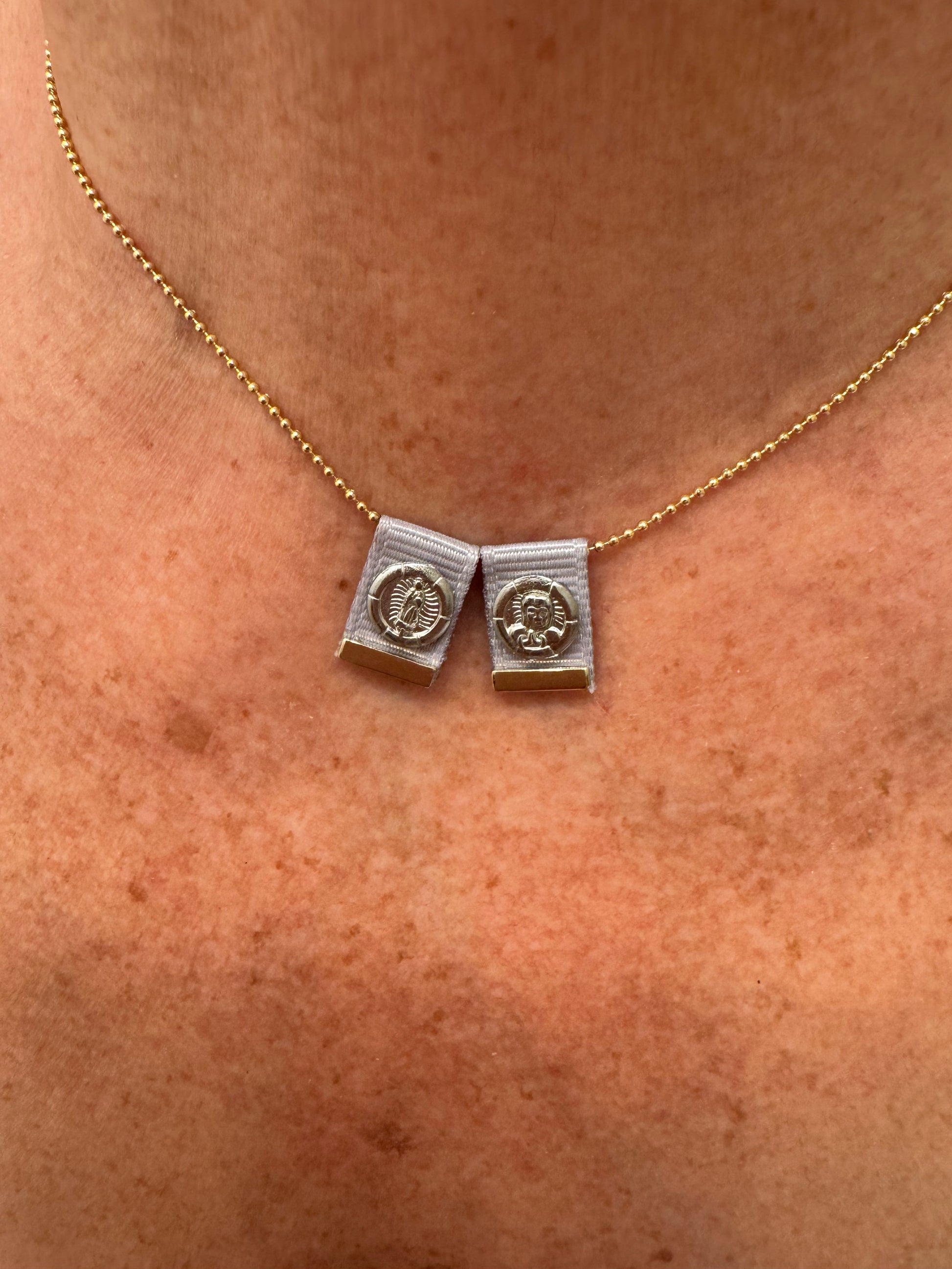Elevate your devotion with the Cuchi Scapular, showcasing Our Lady of Guadalupe and the Sacred Heart in a delicate cotton-inspired mount. Unlike the cord edition, this version features a refined gold-toned chain for a chic, versatile finish. Plated in radiant 18K gold and available in ivory white, pastel pink, and grey.