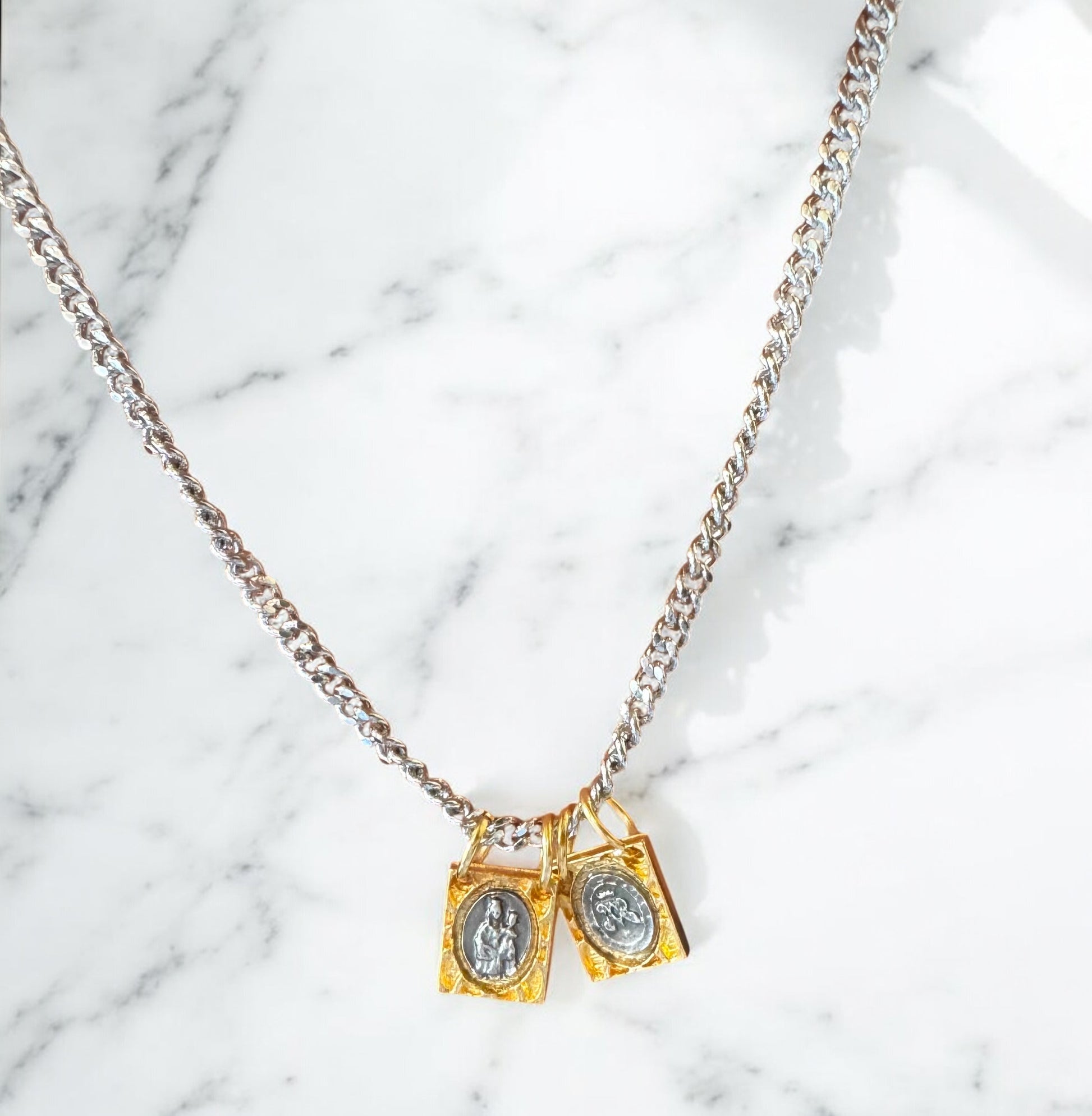 Elevate your style with our Virgin of Mount Carmel Scapular, designed for both men and women who seek a modern expression of faith. Featuring dual pendants of Our Lady of Mount Carmel, each framed in radiant 18K gold plating, this scapular is paired with a bold curb-style chain for a trendy, street-chic look. A versatile piece that blends tradition, elegance, and contemporary fashion, perfect for everyday wear or layering.