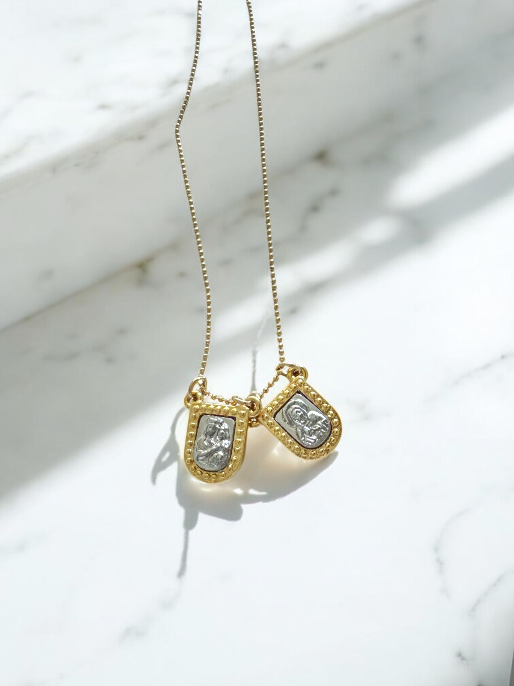 Elevate your style with a piece that embodies tradition and sophistication. The Shield Scapular Necklace, crafted with 18K gold-plated accents, beautifully merges classic symbolism of the Sacred Heart and Our Lady of Mount Carmel (Virgen del Carmen) with modern elegance. Designed for those who appreciate meaningful jewelry, this necklace is an essential addition to your collection.Features & Details