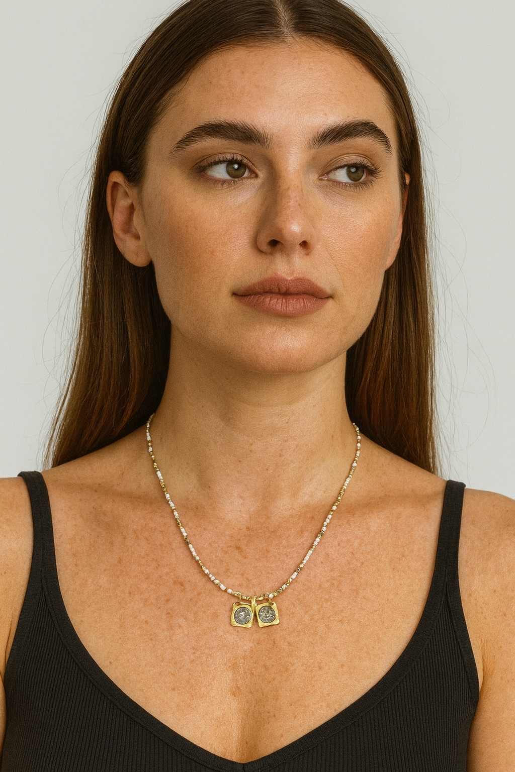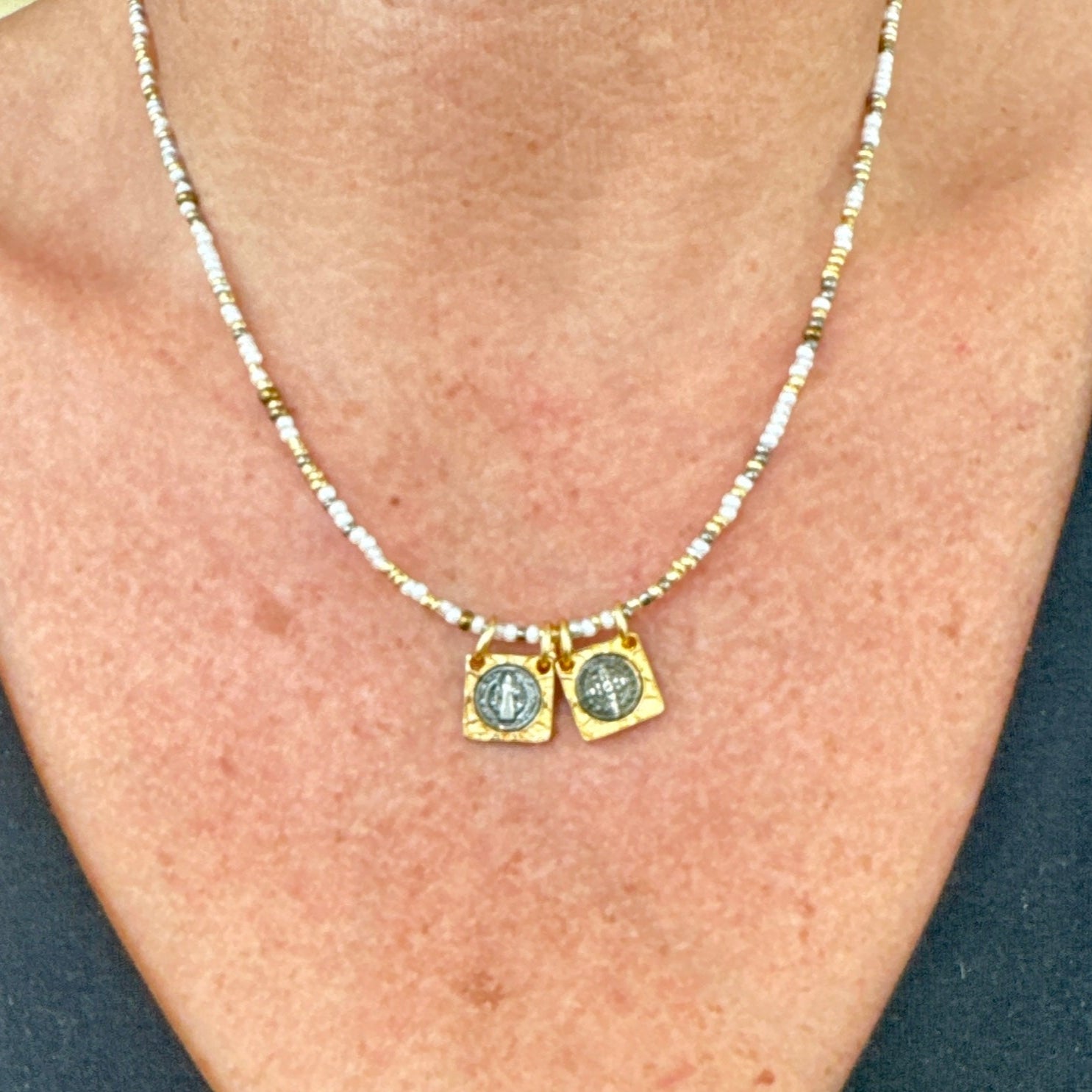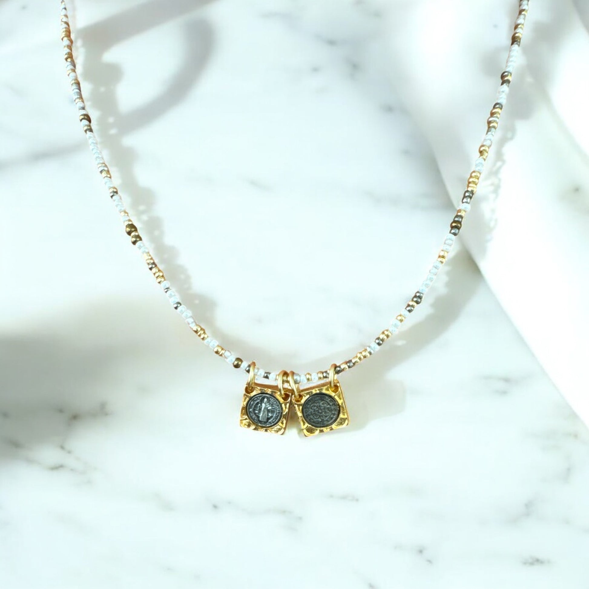 A delicate twist on a classic symbol of protection, the Benedictine Golden - White Bead Scapular features the Saint Benedict medal on dual two-tone square charms. Strung on a dainty strand of mini white beads, the medallions are framed in textured 18K gold plating with contrasting silver tones. Elegant yet meaningful, perfect for spiritual layering or a minimal sacred look.