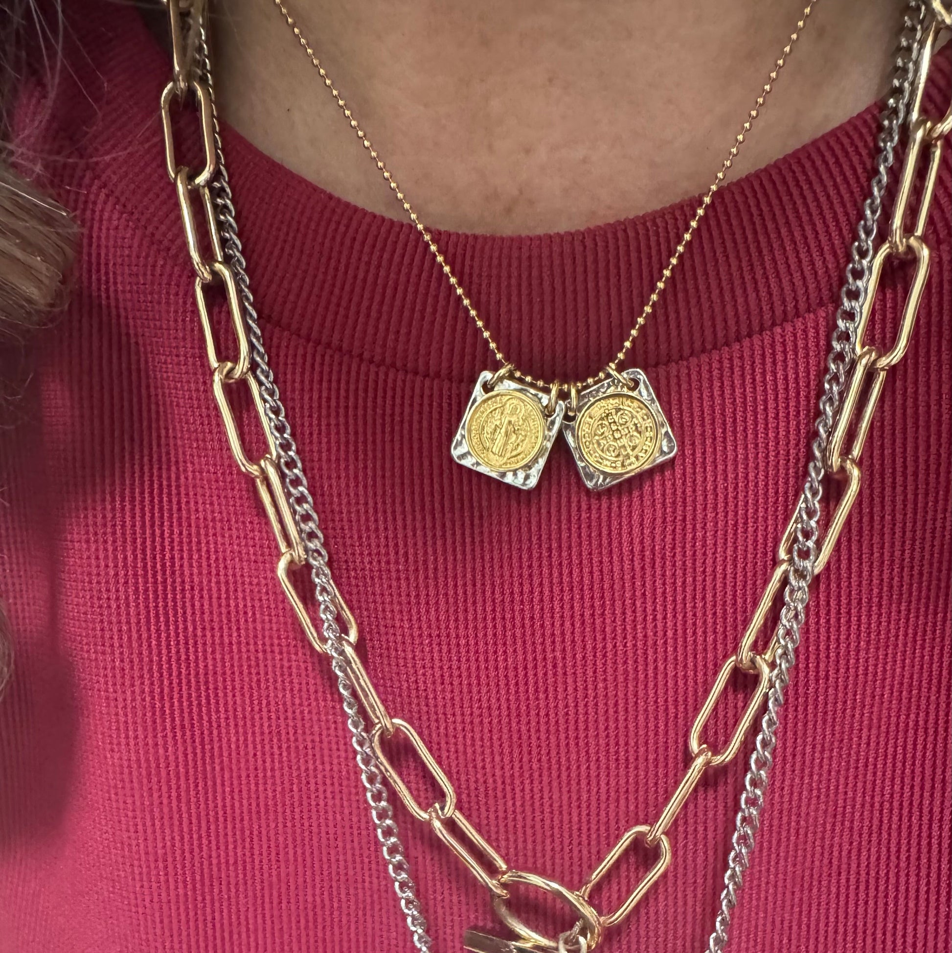 Elevate your faith with the Benedictine Shield Scapular Necklace, a two-tone spiritual accessory featuring the powerful Saint Benedict medal. Set in rhodium-finished square frames with radiant 18K gold plating, this necklace blends protection, elegance, and devotion in one lightweight design. A meaningful everyday piece or thoughtful gift, perfect for layering or wearing solo.