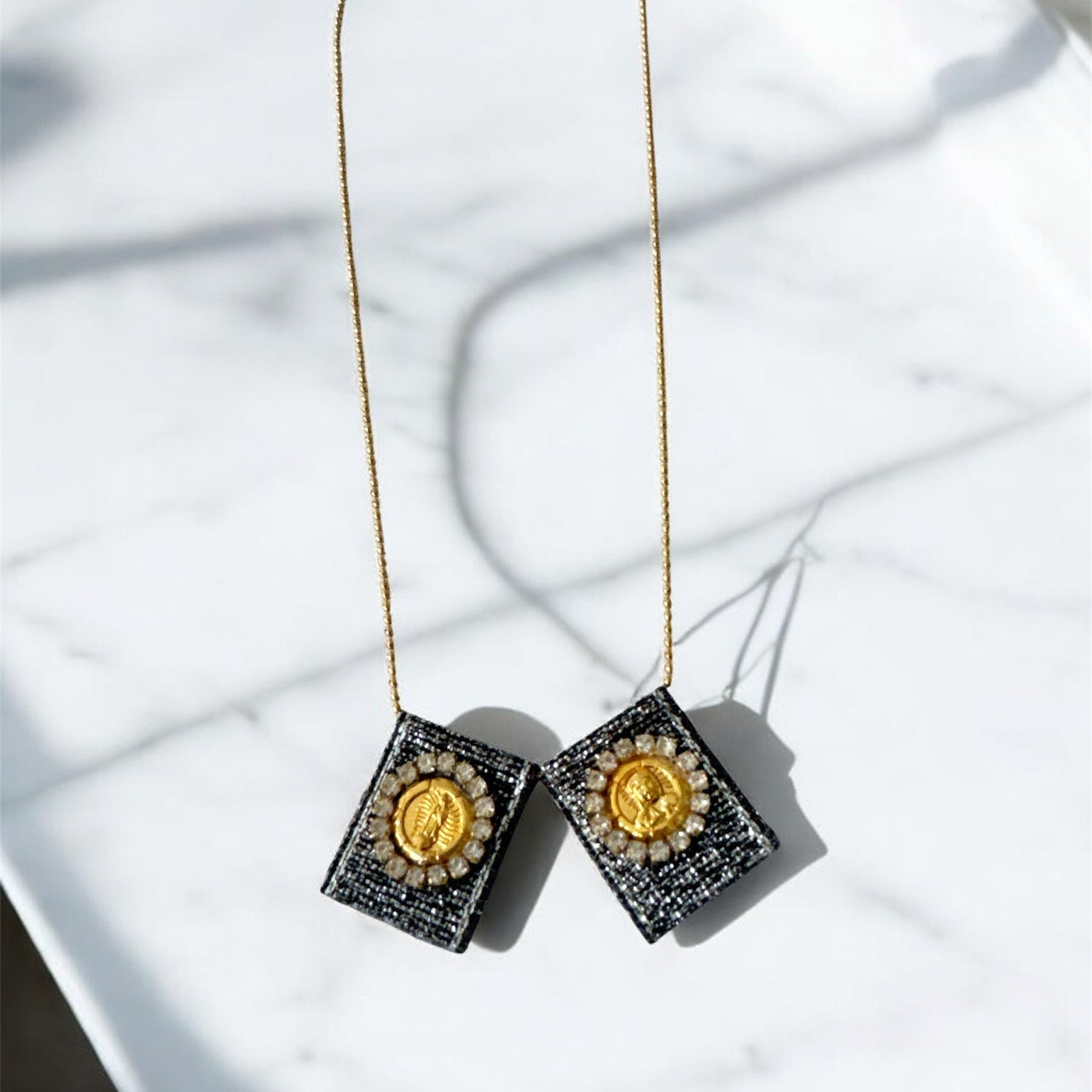 Elevate your spiritual style with our timeless piece, this necklace offers both protection and sophistication. The medals are delicately set on luxurious linen fabric, adorned with mini crystals for a touch of brilliance. Available in a variety of tones, including Shimmering Linen, Navy Blue, Silver and Gold to match your personal style.